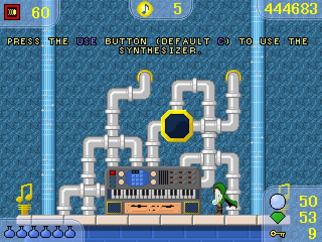 | I love how this looks! After being a little grey box for so long, I just let myself go mad with it. This is going to be roughly central to the hub level, and allows you to combine reward items you've got from enemies into items that give you new abilities. (The wonderful appropriateness of having a synthesizer as the centre of the Music Castle was something that happened entirely accidentally.) |
