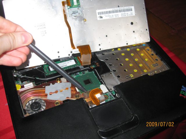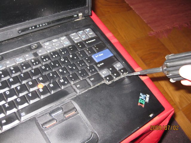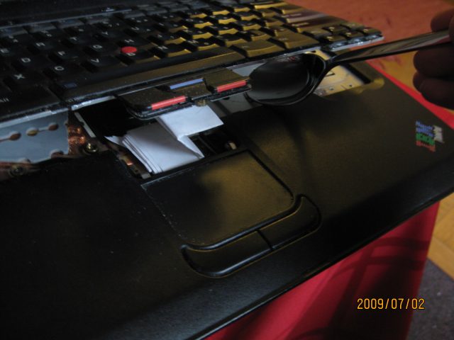 Just as I've been getting better, it's now my work laptop that has become terminally ill - starting yesterday evening after I got back from taking Whitney to the airport, it would manage to get two minutes into Windows before freezing up completely, with no hard drive activity, PC speaker warning noises or response to any input (including being hit with a hammer). After some searching around, I found out that this symptom matched up to a known problem with the T40 range - basically, it's dying of a design fault that causes one or more vital components to become unsoldered from the main board after a couple of years, meaning that the whole thing can die with the slightest amount of movement if it finds the processor suddenly missing. On the advice of another forum I found, to test this diagnosis, I ran it with this crude fix yesterday morning: ![]() And with weight placed on the spot below the keyboard, that allowed it to survive for hours rather than the couple of minutes that it had managed on every other attempt, though obviously it made it slightly difficult to use. During that time I took the opportunity to back up as many useful files as I could think of, and sent a message about its impending death to my boss, who - after a tricky Indiana Jones-like moment when I had to roll the water bottle off it and keep it clamped together while reading the serial number off the bottom - is organizing a replacement. That'll take a while to arrive, though, and in the meantime I attempted a do-it-yourself solution suggested by the Internet, because as we all know my ability in this area is second only to my cooking. ![]() Laptops are at least similar to desktops in how they're laid out logically, but they're a whole lot more awkward to get into because they have to be so compact. Fortunately, the Thinkpads have helpfully labelled screws on the base, so that you don't have to guess which ones to remove and have the screen fall off when you're trying to get the hard drive out or anything. ![]() Once the screws have been removed, the disassembly guide says that you can easily slide the keyboard a little backwards with the press of a thumb below the power button. When I tried this, the machine woke up during surgery instead and I had to quickly kill it before it realized what was happening. In reality, you need the aid of a couple of wedges and a crowbar to get the keyboard off - you have to force it towards the back end at both edges so that a couple of clips clear the front of the case, then lever it upwards. ![]() But with the keyboard eventually off, the internal components are exposed. (You can remove it entirely rather than prop it up as I've done here, but it's attached to the innards with a fiddly and fragile-looking plastic contact and I didn't want to risk breaking it any further). The bit we're after is the processor - what needs to be done here is to add some extra non-conductive padding to the top so that when they keyboard's back on it presses down on it and holds it in place. ![]() The guide I was using took the approach of stuffing it full of Post-It notes, but for my padding I used a single piece of paper. The most suitable one I had to hand was one of the CVS pharmacy's typically colossal receipts - I got this one last weekend for buying a packet of Fruit Pastilles or something there. ![]() And after folding the strip of paper into a concertina to form a spring, like Tony Hart used to show us, it needs to be balanced on the processor and the keyboard gently lowered into place on top of it using whatever implements you have to hand. (Getting the keyboard back on again is almost as awkward as removing it - it has to be in exactly the right place or the spacers attached to it will hit bits of the case, and then you have to haul it towards you with the palms of your hands until it slides back into place). Turn it over again, put the screws back if they still line up, and the Thinkpad should be miraculously brought back from the dead. And with this unlikely and unorthodox solution in place, it seems to be running quite healthily, even if it does have an awkward bulge underneath the Space bar. I would at least hazard that it'll be as usable as usual until proper salvation arrives. 2009-07-03 12:50:00 3 comments |
