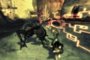 The presentation of the twilight sections - which you have to switch in and out of from the normal world a few times near the start of the game - is oddly Tron-like, with very blocky edges and circuit board-like lines over everything, and inhabited by unnatural creatures like giant birds with their heads sort of inverted into flower shapes. When anything emerges into the world it's built up from a shower of twitching black squares. The whole thing is really made to look like an unnatural "rip" in the game.