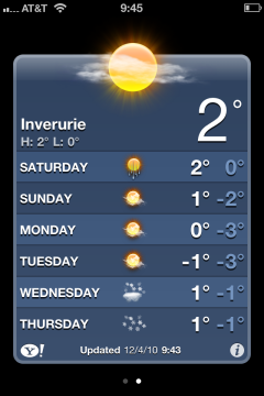 The world's longest game of Scrabble came to an end this week, with ravenworks finally besting me by 23 points in a game that started in September and rapidly degenerated into a Most Rubbish Word contest. There's something vastly unjust about the way that "Quark" and "Helios" can score mediocre amounts, and yet be effectively countered by words like "HEY", "ARF" and (a 31-pointer from me) "ZA". What's a za? I was only fiddling around with the triple-letter square to see if it would accept such tomfoolery.Now that I'm getting used to the iPhone and all it can do for me, something I'm still unsure of is its choice of weather icons. I have mentioned the apocalyptic raining sun before, but in Inverurie on Wednesday, it would seem that it's telling me it's going to snow upwards. That, and that at this time of year the temperatures resemble a fairly decent golf scorecard. I used to love the prospect of snow. Now it just feels like a massive inconvenience. Such is the injustice of life. 2010-12-04 10:07:00 6 comments |
