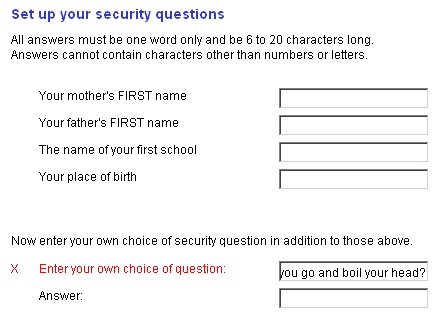 But in one last effort when I went back to it yesterday, I tore into the Javascript of the page, and realized that their question field was subject to the same restriction as the rest of the fields - you can have no spaces or special characters (such as, fairly importantly, a question mark) in your question, or it won't be accepted. Oddly, the "20 characters" restriction was lifted for this box, so while even an effort like "What_is_your_favourite_colour?" won't be accepted for its special characters, if you pare it down to "whatisyourfavouritecolour" then you can finally get through. Perhaps they were expecting their customers to ask only things like "Why?" or "Toast?" Except those have got question marks in them. My security question is now "whoisseventeenofthirtytwoalsosortyoursiteout" (which you can puzzle out for yourself), I have got back into my accounts, and I've emailed the bank at the only address I could find for them - the Contact Us page advises looking in the Online Banking Help, which redirects you to the Contact Us page - but I haven't received a reply yet. I have to wonder how they haven't noticed an extreme drop in new online accounts being created... 2010-12-09 11:49:00 3 comments |